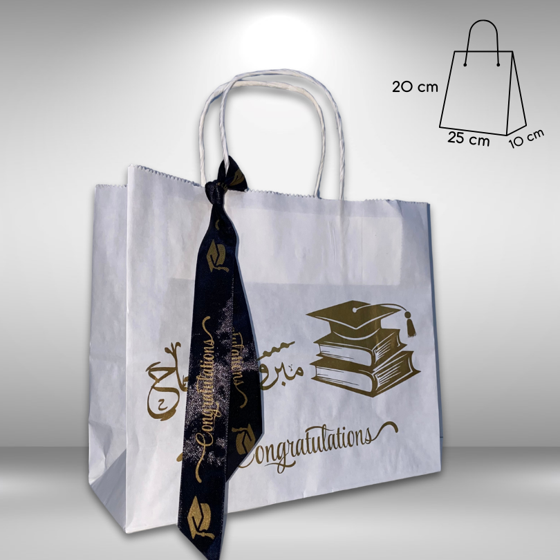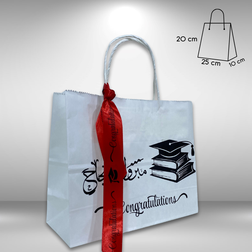 50 كيس ورقي ترافقكم لتوزيعات حفلات النجاح مصممة بتصميم مميز مع عبارة “ألف مبروك النجاح” والتي تمكنكم من تقديم علب الحلويات والمشروبات بطريقة راقية.
